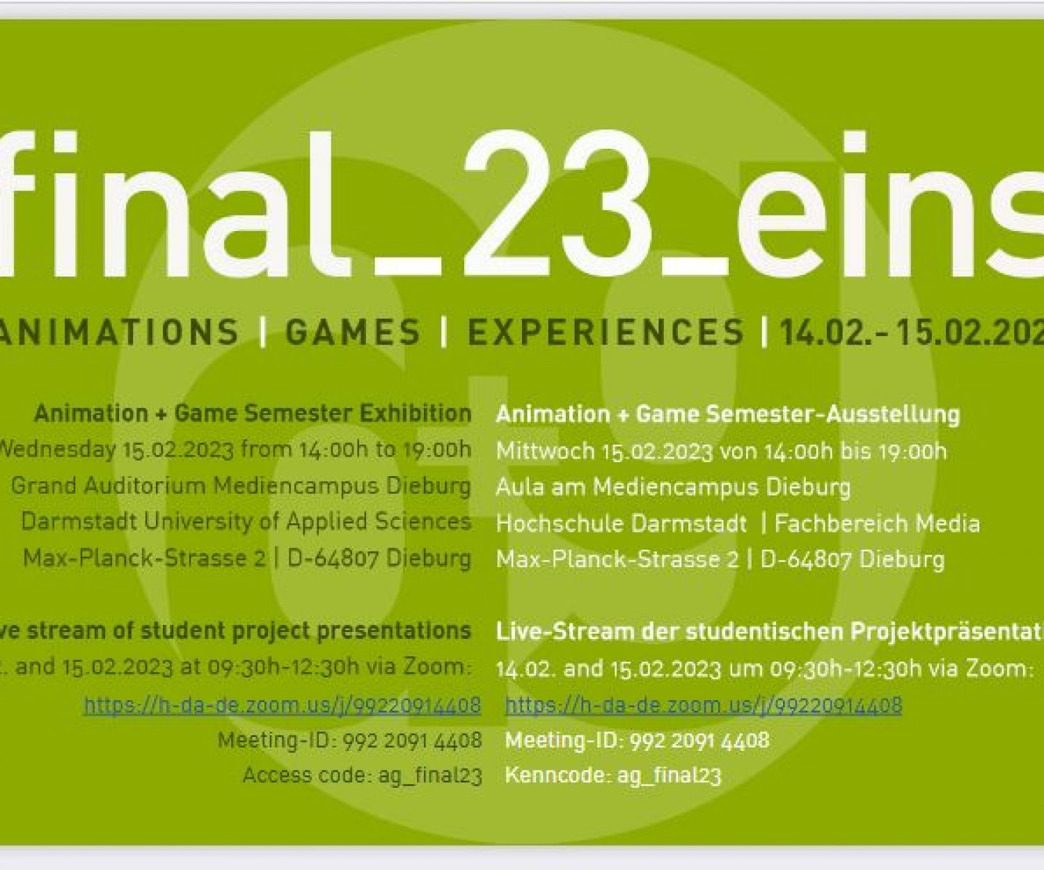 Hallo Zusammen, am Dienstag und Mittwoch, 14. und 15. Februar sind wieder unsere Semester-Abschlusspräsentationen online zu bewundern. Darüber hinaus freuen…