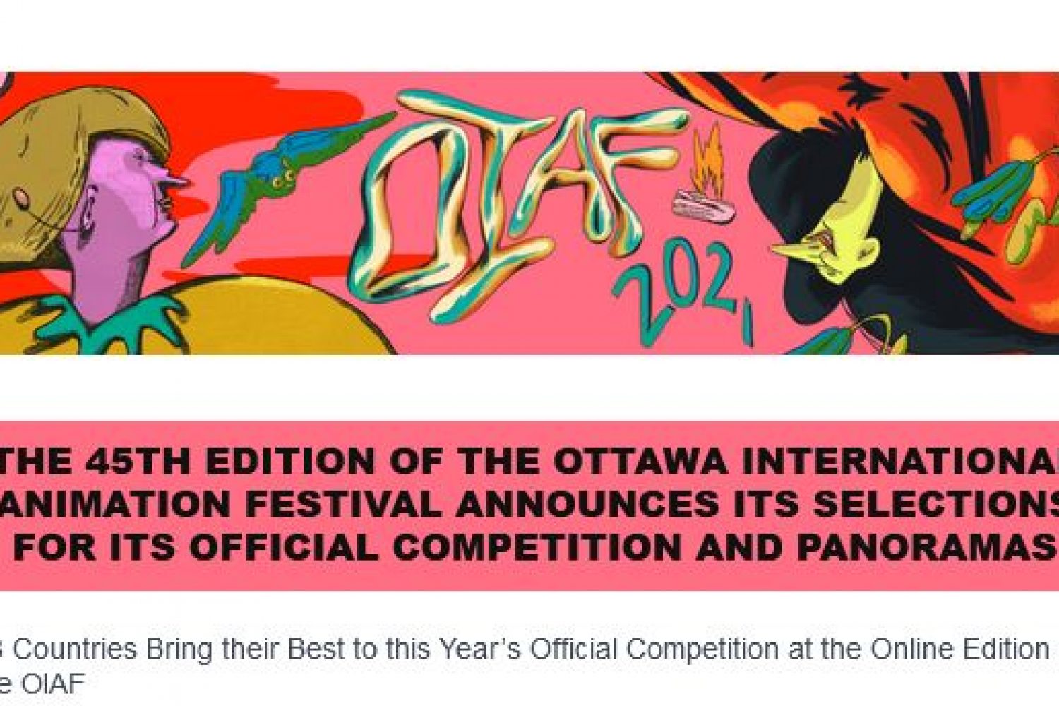 OTTAWA (July 15, 2021) – The Ottawa International Animation Festival (OIAF) announced its Official Competition selections today. With 2528 entries received from countries around the globe, this year’s festival shows that although the world may have slowed down, animation did not. Of the entries received, 107 films and animated series from 38 different countries were selected for Official Competition. 48 of those entries are being showcased as a part of OIAF’s Panorama screenings (This number does not include those entries selected for the VR category, which will be announced in August).