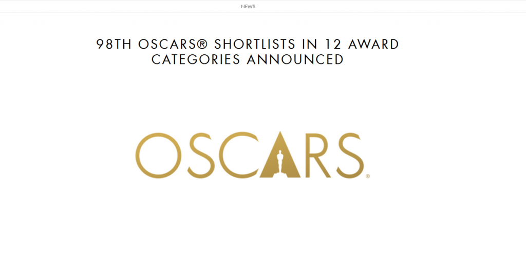 98TH OSCARS® SHORTLISTS IN 12 AWARD CATEGORIES ANNOUNCED – Animated Short Film & Visual Effects
