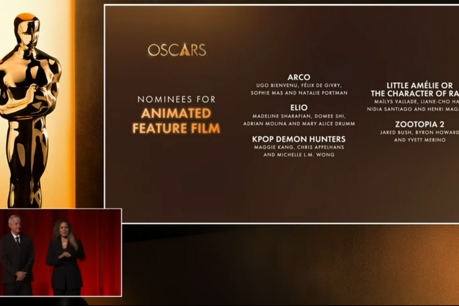 Brooks and Pullman announced the nominees in two groups starting at 5:30 a.m. PT, followed by the remaining categories at 5:41 a.m. PT. For a complete list of nominees, visit www.oscars.org.