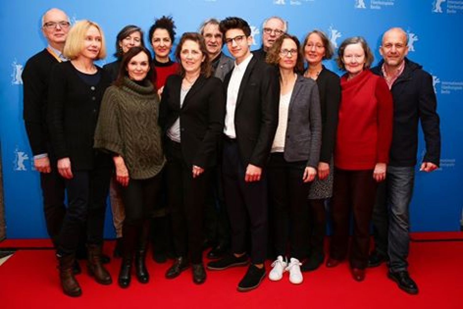 Vordere Reihe von links nach rechts: Dagmar Rehbinder (Drehbuch), Jasna Vavra (Head of Theatrical Entertainment Universum Film), Petra Müller (Geschäftsführerin Film- und Medienstiftung NRW), Noah Levi (Stimme von Hasenjunge Max) und Katja Grübel (Drehbuch) bei der Weltpremiere von DIE HÄSCHENSCHULE – JAGD NACH DEM GOLDENEN EI im Berlinale-Wettbewerb Generation Kplus am 11. Februar im HKW.