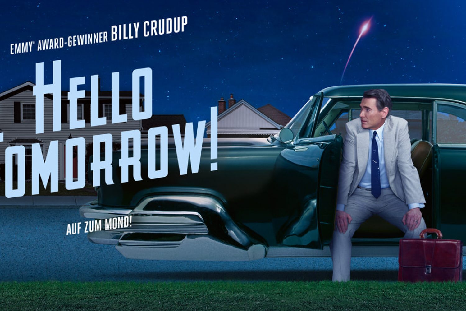 Set in a retro-future world, Hello Tomorrow! centers around a group of traveling salesmen hawking lunar timeshares. Billy Crudup stars as Jack, a salesman of great talent and ambition, whose unshakeable faith in a brighter tomorrow inspires his coworkers, revitalizes his desperate customers, but threatens to leave him dangerously lost in the very dream that sustains him.