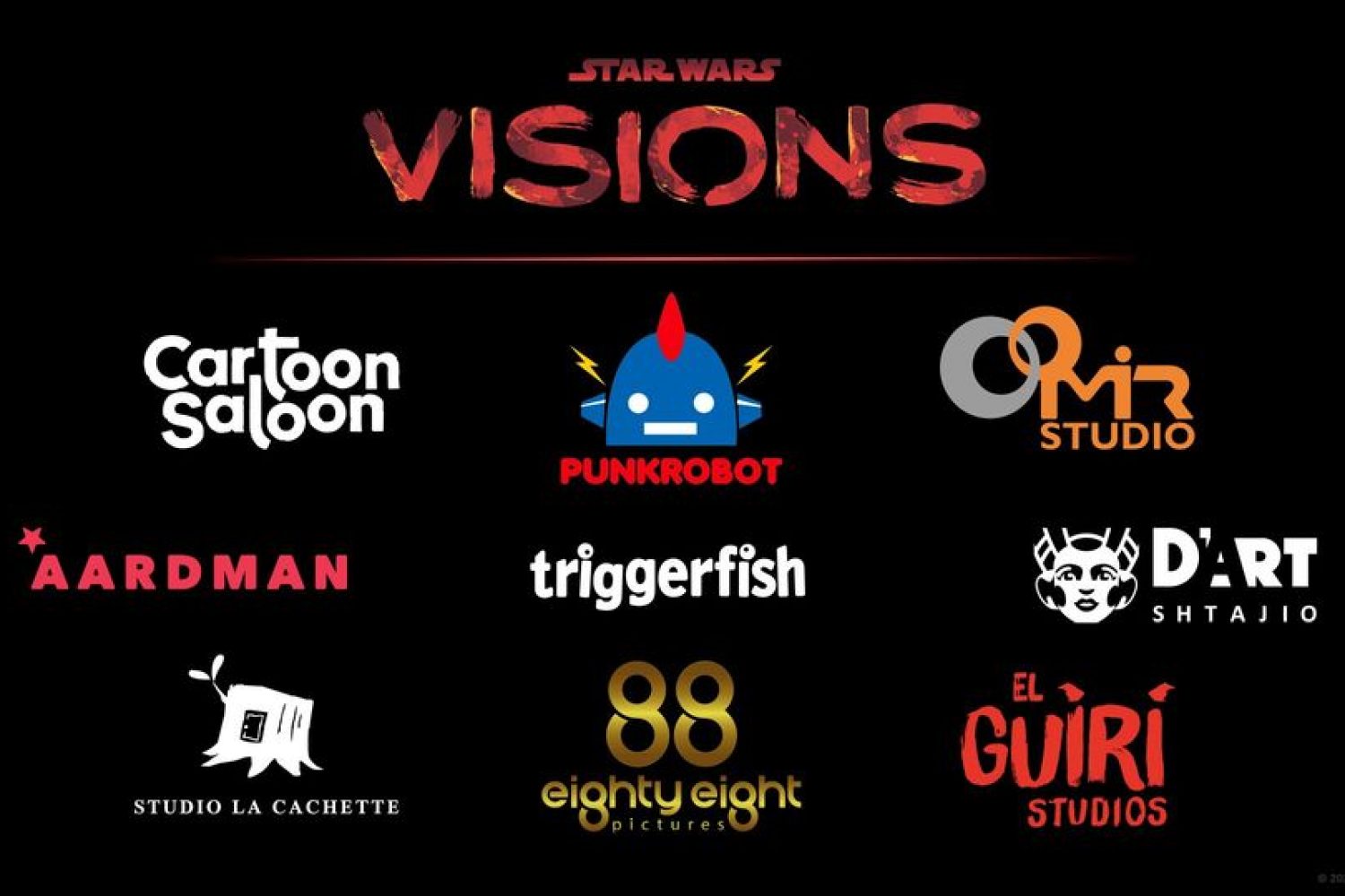 El Guiri (Spain), Cartoon Saloon (Ireland), Punkrobot (Chile), Aardman (United Kingdom), Studio Mir (South Korea) Studio La Cachette (France), 88 Pictures (India), D’art Shtajio (Japan), and Triggerfish (South Africa). D’Art Shtajio’s short was created in collaboration with Lucasfilm Ltd. (United States).