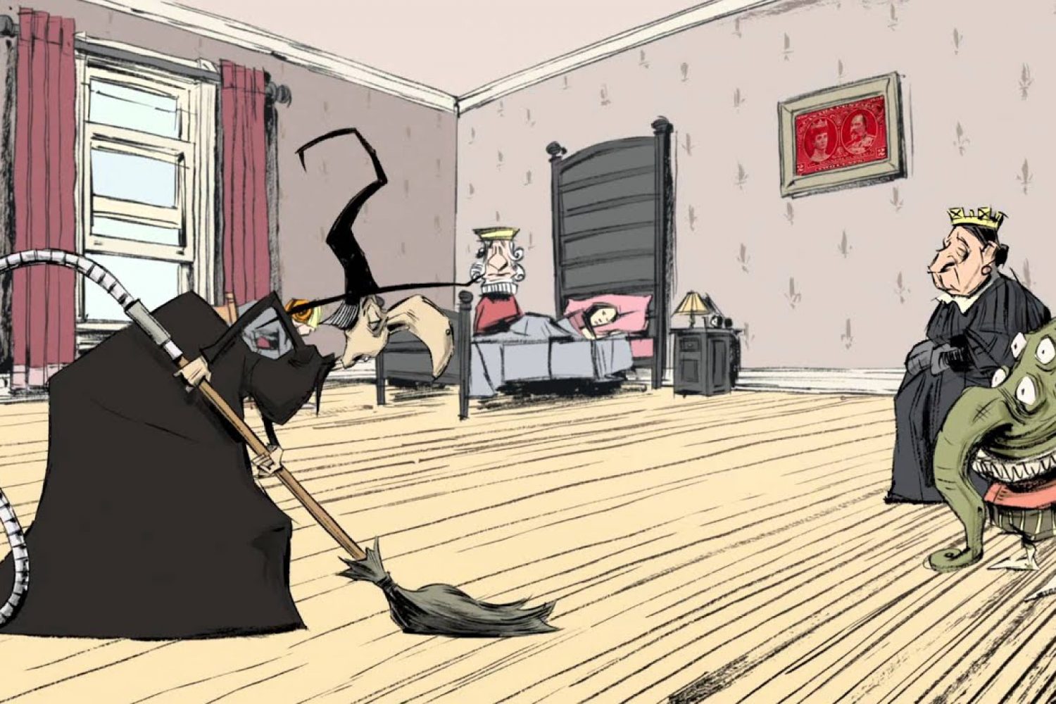 In this animated short, Sleeping Betty is stuck in bed, victim to a strange bout of narcolepsy. The King calls on his subjects to rescue her and they all respond to the call: Uncle Henry VIII, Aunt Victoria, an oddly emotional alien, a funky witch and a handsome prince. But will a kiss really be enough to wake the sleeping princess? The film, drawn in ink, is a classic example of the anachronistic and playful world of Claude Cloutier.