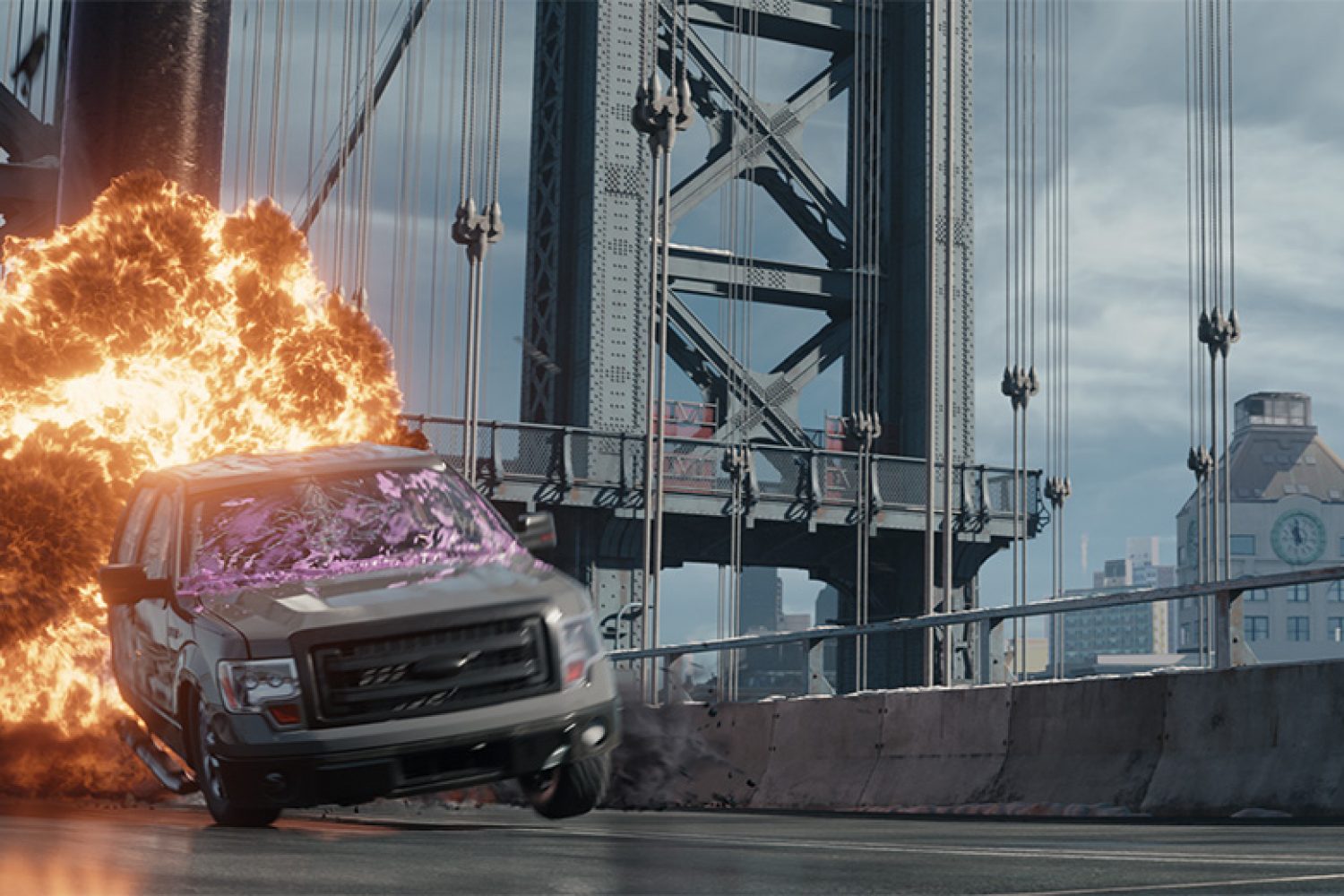 A key feature of our work on Marvel Studios’ Hawkeye is the high-speed car chase where Hawkeye and his sidekick are pursued across the streets of Brooklyn, through a Christmas tree sales yard, and onto the Manhattan Bridge. Using a fully digital model of the bridge combined with matte paintings and CG set extensions, we transformed plates shot on location into the familiar skylines of New York.